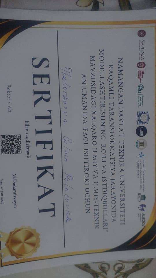 2025 жылдын, 4-декабь куну Наманган мамлекеттик техникалык университети тарабынан уюуштурулган "Эсептоо трансформация процессинде моделдердин ролу жана келечеги"- деген темада Эл аралык илимий-практикалык конференция болуп отту. Конференцияда доклад окуп сертификат алдым.